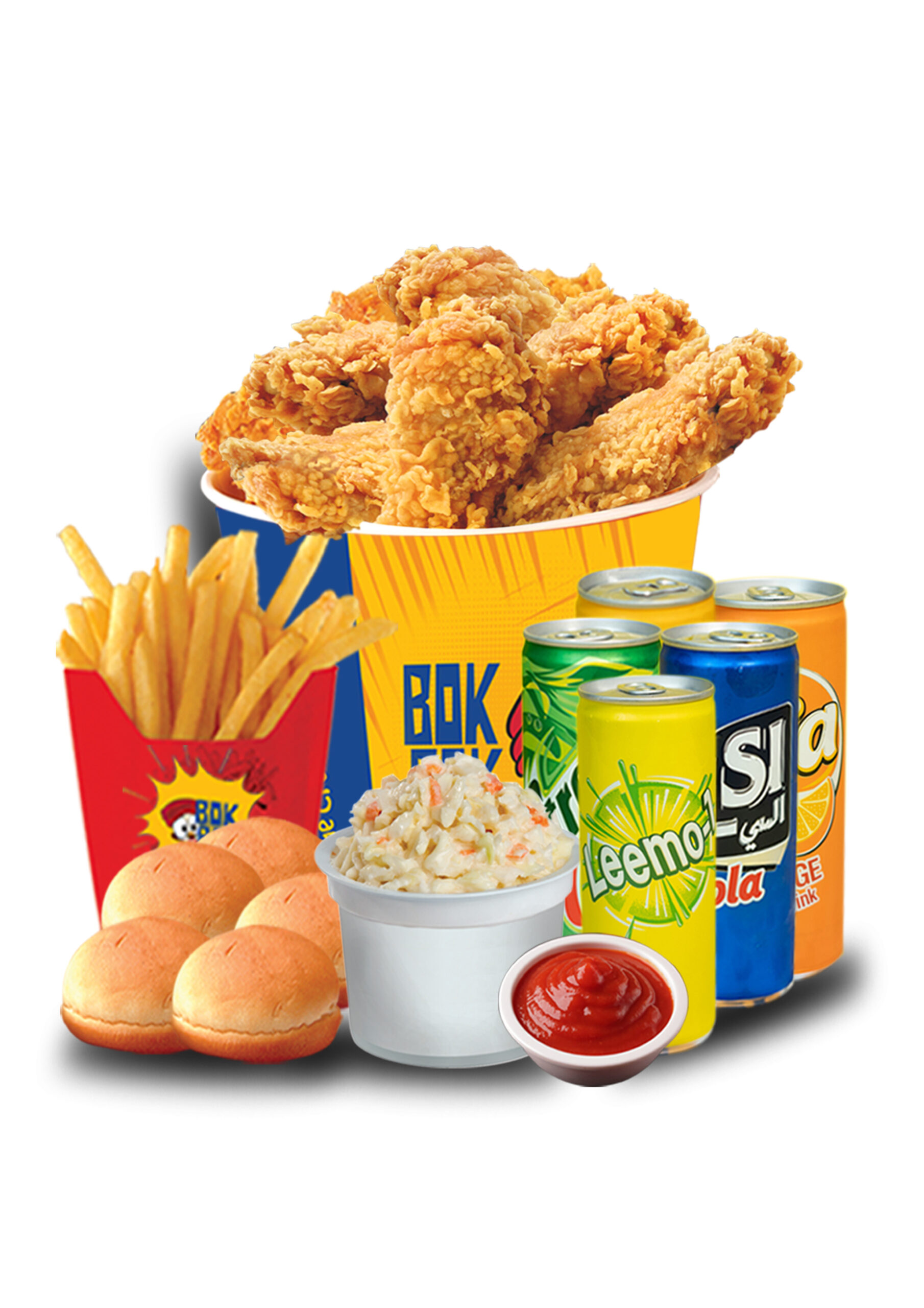 15 pcs chicken + 5 buns + fries large + coleslaw large + ketchup + 5 drinks of your choice